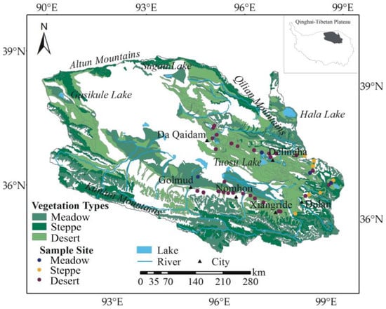 The Qaidam Basin, located on the northern part of the Qinghai-Tibet Plateau, northwest of Qinghai Province in China, is a closed tectonic basin surrounded by the Altun Mountains, Kunlun Mountains and Qilian Mountains. The basin is divided into two parts, including arid desert area inside the basin and alpine area around the basin. The inner elevation is 2652–3350 m and the annual precipitation is 15–200 mm in the basin. The around the basin is cold with an altitude of 3560–6860 m. The basin has a typical plateau continental climate with low rainfall and high evaporation [42]. Rivers and lakes such as Gasikule Lake, Hala Lake and Golmud River are widely distributed in the basin (Figure 1). The biogeographical province of the Qaidam Basin belongs to “Takal-Makan-Gobi Desert of the Palaearctic Realm” and its characteristic biome is in the group “Cold-winter (continental) deserts and semi deserts” [43]. The vegetation in the Qaidam Basin is relatively sparse with simple plant communities. According to the characteristics of composition, appearance and structure of vegetation communities, there are nine types of vegetation communities in the basin according to the Chinese vegetation classification, such as desert communities (e.g., Ceratoides latens and Nitraria tangutorum), steppe communities (e.g., Stipa purpurea and Achnatherum splendens), meadow communities (e.g., Kobresia tibetica and Phragmites australis) and forest communities (e.g., Sabina chinensis). Desert, steppe and meadow communities are the main types of vegetation in the basin. In this paper, we investigated and photographed many communities such as Ceratoides latens desert, Haloxylon ammodendron desert, Stipa purpurea steppe, Kobresia humilis meadow, etc.