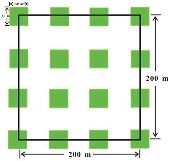 Design of Sample Site (the sample site is 200 m × 200 m, with each sample site including 16 sample plots with 50 m × 50 m; the shooting point of the UAV is at the center of the sample plot).