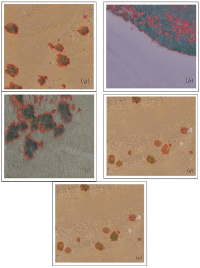 Local identification of FVC by the threshold adjustment method ((a): desert; (b): steppe; (c): meadow; (d): desert vegetation recognized by threshold adjustment; (e): desert vegetation recognized by threshold adjustment and visual interpretation).
