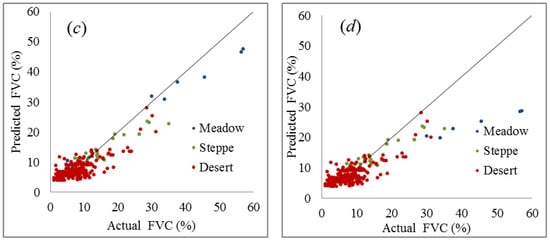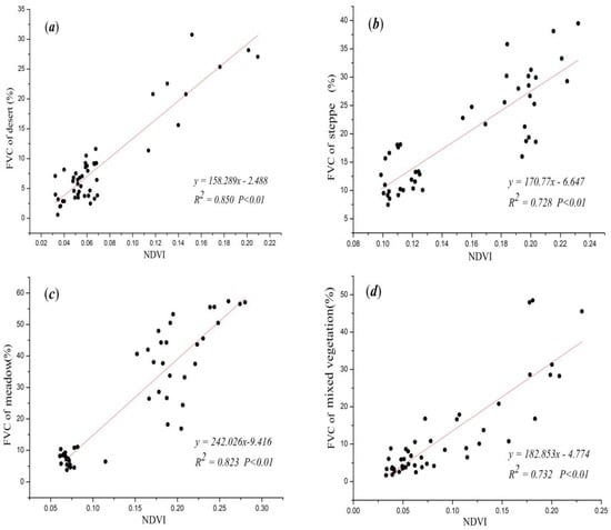 Regression model between the NDVI and FVC ((a): desert; (b): steppe; (c): meadow; (d): mixed vegetation).