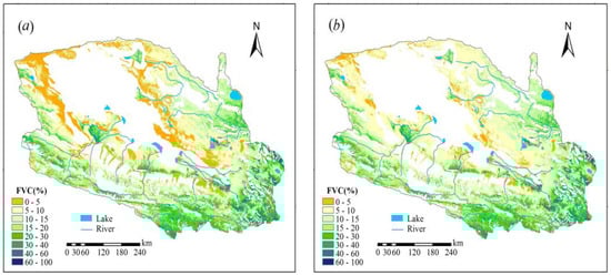 The VCI and VMI estimated by the PDM also showed a semi-ring decreasing trend from the east and southeast to the northwest of the basin (Figure 6), and the average FVC was 16.5% and 13.8% respectively. VCI produced lower inversion values in extremely low-density vegetation cover areas and higher inversion values in high-density vegetation cover areas (FVC > 80%). Differences in FVC were mainly in the central and western regions of the basin, the low mountains and intermountain basin to the east of Dulan, and the southwest Kunlun Mountains. The area of extremely low-density vegetation cover accounted for 52% of the total area in Figure 6a, of which FVC ≤ 5% accounted for 22.5%. However, the extremely low-density vegetation cover regions are located in the central part of the basin in Figure 6b, primarily in the southwest Da Qaidam-Delingha borderline and the surrounding Gasikule Lake, and the area of FVC ≤ 5% only accounted for 13%. Similarly, meadow region of the basin, which are mainly distributed in the low mountains and intermountain basin to the east of Dulan, the mountainous steppe region to the south of Xiangride and regions at the front edge of the alluvial-proluvial fan such as the narrow strip of oasis to the north of the Golmud-Numhon borderline, also exhibited the most obvious differences in FVC.