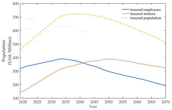 The cohort component method has been widely adopted to project the structural variations of the population in a certain area over a period [,]. The age-specific iterative transition equations play an important role in this method, and these equations can be expressed in a concise matrix form, known as the Leslie matrix []. The population of insured employees and retirees is determined by not only the total population and the urbanization rate but also the urban employment rate and the coverage rate of the public pension system. In this section, the cohort component method is utilized to project the age-sex-specific population in China, and this is then combined with several assumptions of relative proportion parameters to model the variation of the population of insured employees and pension beneficiaries.