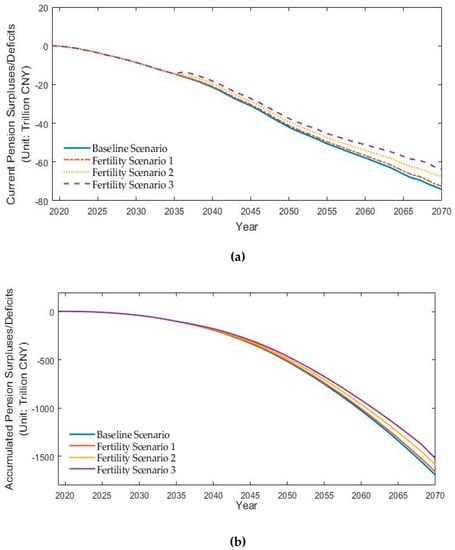 Table 3 provides the simulation results. Both the pension revenue and pension expenditure would increase year by year. However, the growth rate of the former is much higher than that of the latter. As described by the data (see Table 3), the current pension deficits and the accumulated pension deficits would occur in 2020 and 2024, respectively, and both would remain negative after that. In 2070, the current deficits would reach CNY 74.23 trillion, and the accumulated pension deficits would arrive at CNY 1694.89 trillion. These trends indicate that the public pension system would suffer from severe financial pressure, and further policies should be introduced to improve the sustainability capacity of the pension system.