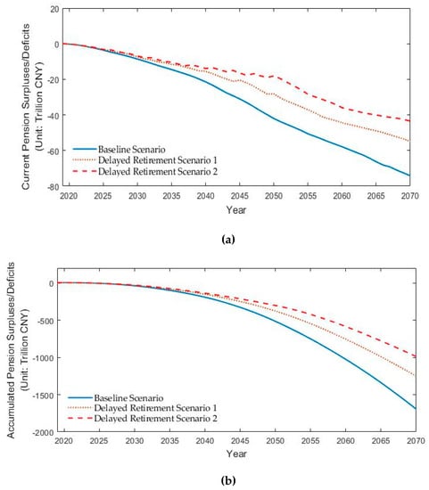 As mentioned previously, China’s partially accumulated pension system of urban employees has devolved into a pay-as-you-go system that provides definite benefits for retirees. In this context, the present research uses current pension surpluses/deficits, accumulated pension surpluses/deficits, and the dependency ratio to monitor the financial sustainability of the public pension, all of which have been commonly adopted indicators for a defined-benefit pension system [,,].