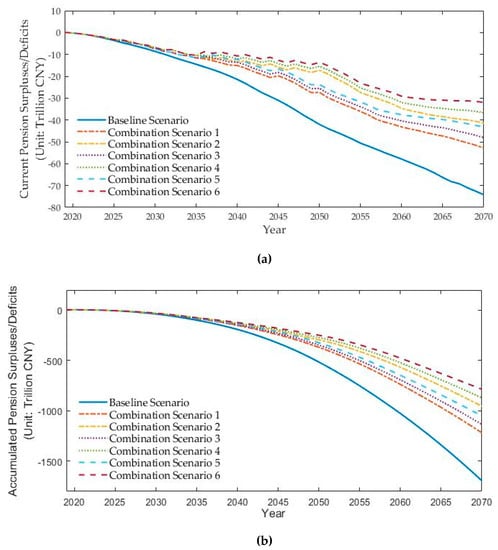 Trends of pension surpluses/deficits under combination scenarios. (a) Current pension surpluses/deficits; (b) accumulated pension surpluses/deficits.