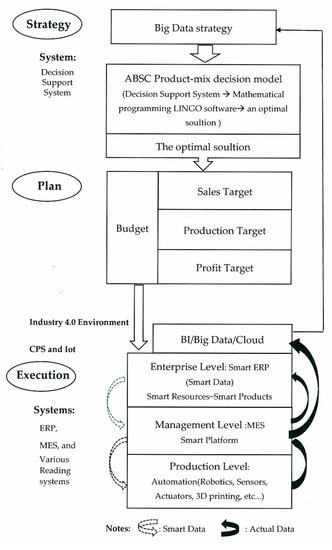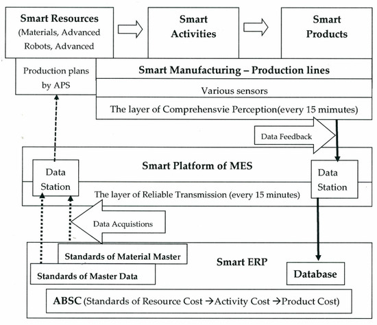 It is assumed that ABSC (Activity-Based Standard Costing) is embedded in the ERP link with MES, which creates the data storage and information exchange and updates each other every 15 minutes [2,10,31]. From the business practice point-of-view, all industry-relevant objects, such as raw materials, products, machines, customers, and supply chain, can connect with each other for exchanging information and controlling actions independently or autonomously [2,9,15]. Various resources and activities in the ABSC are embedded in an intelligent ERP [10,15], which is also a subsystem of MES. MES is a powerful platform that automatically connects to all independent systems and immediately delivers accurate costs for each product due to its smart integrated data stream including data acquisition, data collection, data storage, data calculation, and data analysis [12,20,27]. Thus, MES’s data application can be applied to customers, channels, or markets in a timely manner to fulfill computerized production management [11,24] in the future digital era.