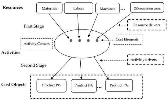The ABC model uses a two-stage procedure to calculate product costs: resource drivers and activity drivers. Resource costs are traced to activities using resource drivers, and then, activity costs are traced to cost objects using activity drivers as shown in Figure 2. In the first stage, various resource drivers are used to assign resource costs to the related activities. In the second stage, the activity costs are assigned to the products using the activity drivers. Each activity center usually consists of related activities through a clustering process [27,30,39]. Additionally, all elements of each activity cost pool come from different resource costs and can be traced to their related activity center [23,28,29].