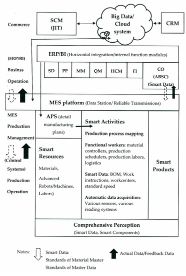 On the other hand, the ABC model has been used in the ERP system for a long time. Assuming that the ABSC model will be used in the ERP system, we must consider the issue of system integration. For example: (1) Smart data are embedded in the ERP system and can share all smart data to related smart objects before production [10,15]. The system-to-system issue, ERP, and MES system-related data issues are from data acquistion to data feedback [15,24,27].