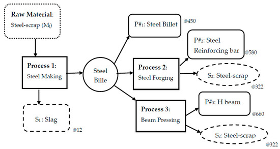 The flowchart in Figure 5 describes the processes in steel manufacturing. This study includes two main stages. On the one hand, we focus on incorporating the above costs (e.g., Material cost, Labor cost, Electrical power cost, CO2 emission cost, Machine cost, and other indirect costs) through a mathematical programming approach and obtain the optimal decision using the LINGO software. On the other hand, we hypothesize and enhance the value of steel-scrap raw materials for P#1 products in the process of steelmaking to achieve maximum profit. The flowchart of the steel factory is shown in Figure 5.
