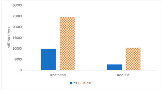 Figure 1 shows the growth in worldwide biodiesel and bioethanol production in 2006 and 2016. During this period bioethanol experienced roughly a 140% increase, whereas biodiesel experienced a 300% increase. The increase for bioethanol has mainly been driven by North, South, and Central America. The geographical areas pursuing a biodiesel route are primarily Europe and Eurasia. Future biodiesel growth is forecasted to be around 3% over the next five years. This growth is expected to come from mainly Latin American and non-OECD Asian countries. The forecast for the European Union (EU) and the United States (US) is lower [17]. Even with a high increase in biodiesel production, biodiesel is still lagging behind bioethanol.