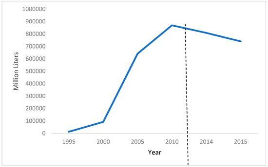 Figure 2 [28] shows Germany’s consumption of biodiesel between 1995 and 2015. There was a consistent increase in the consumption of biodiesel in Germany from 1995 to around 2010/2011. From 2002, there was a steep increase in consumption over the next five years. An existing tax exemption was slowly being replaced with a blending mandate from 2006 [29] and was completely abolished in 2012, as indicated by the dashed line. A drop in consumption is seen in 2010 where the likely increased price of biodiesel is exceeding consumers’ willingness to pay. The tax exemption was replaced with fuel supplier mandates. In this instance a mandate refers to a certain level of biofuel that fuel suppliers had to blend or sell. The mandate in Germany was that 5.75% of fuel suppliers’ sales had to be biodiesel [24]. Despite the mandate in place, consumption was still decreasing. There was no legislation stating that the biodiesel had to be used in a domestic capacity, and since 2012, exports of biodiesel from Germany has been increasing [30]. An alternative to giving tax incentives to consumers is to give it to the producers of biodiesel. This is the approach that the United States (US) took.
