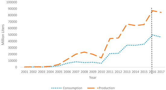 Figure 3 shows the US’ production and consumption of biodiesel between 2001 and 2017. Production began to increase more noticeably from 2005. During this time, a tax relief was present for the production of biodiesel and this encouraged production [31]. However, there were few incentives for consumers. Instead of selling to the domestic market, the US began exporting more biodiesel [32]. The tax relief was abolished in 2016 and there was a slight decrease in production, as indicated by the dashed line. When the tax relief was abolished, there was no replacement or alternative introduced. From the evidence of production dropping when there is no tax relief present, the US was set to reinstate the tax relief mid-2017 [33].