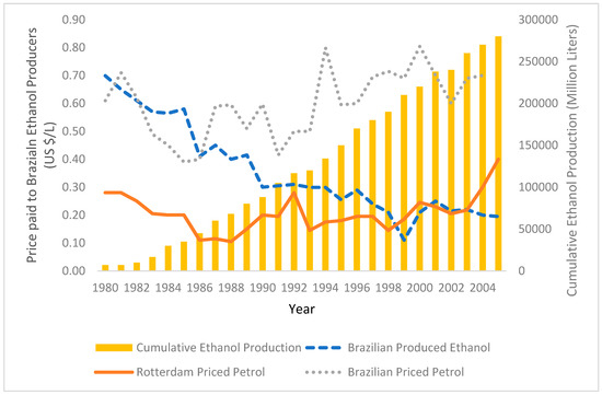 Figure 4 shows the production of ethanol in Brazil and the prices of Brazilian ethanol, international gasoline/petrol, and Brazilian gasoline from 1980–2005. In 1980, the price paid for Brazilian ethanol was more than double that of international gasoline, even though subsidies were being given to ethanol production. From 1990, subsidies were slowly removed as ethanol became more competitive with Brazilian gasoline. From 2002 to 2005, Brazilian produced bioethanol had a slow decreasing price, whereas international gasoline had a sharper increase in price—thus making ethanol cheaper than petrol by around US $0.22/L. During this time, all subsidies were removed from the production of ethanol making, and it is competitive with international gasoline without the need for government intervention. By 2005, bioethanol was 60%–70% of the price of international gasoline [48,49,50]. Brazil is a good example in that with a supportive structure and framework in place it is possible for biodiesel to become successful. The price of ethanol is decreasing as ethanol production increases. This shows the link between the price of ethanol and scale of production, i.e., the larger the production the lower the marginal cost.