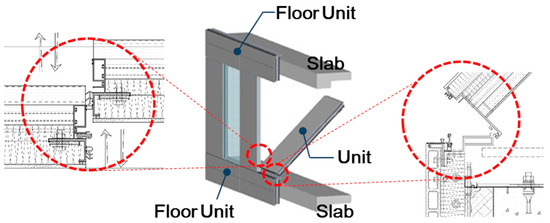 As shown in Figure 2, floor units were installed by fixing them to each slab, and units could be assembled with a tilt-in method from the interior side. Depending on the size and weight of the EPW, it could be transported and installed using small-scale equipment. The use of modularized units makes it easy to install them on site. In South Korea, the external wall is constructed by concrete and is installed inside insulation, as with most apartments. The advantage of this method is that it can shorten the construction period. On the other hand, in general, installing outside insulation requires the installation of scaffolding or gondola and so on.
