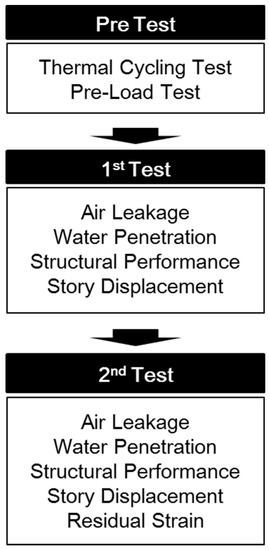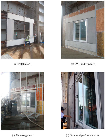Figure 3 shows flowchart of the experiment to evaluate each performance item. The experimental methods and criteria are shown in Table 2. The performance of the building envelope that connected EWP with windows was evaluated in accordance with the standard test method for the structural performance of external windows, curtain walls, and doors. Figure 4 shows the installation of the experimental subject and its performance testing.