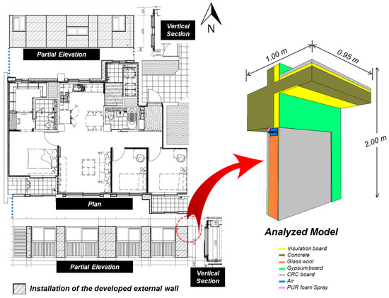 Figure 5 shows the floor plan of a household where the developed EWP is going to be installed. The floor plan had a size of 59 m2. The house had three bedrooms, one kitchen, and two bathrooms. The EWP was planned to be installed at the north and south of the plan. Figure 5 shows a partial cross-section drawing of the EWP. The image on the right of Figure 5 shows a simulation model to evaluate its thermal properties. It shows that the ceiling part is joined with the developed EWP and the insulated-concrete wall of an adjacent household. The insulated-concrete wall had 140 mm concrete, 110 mm insulation materials with a thermal conductivity of 0.03 W/(mK), and 9.5 mm gypsum board.