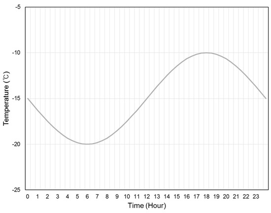 To evaluate the thermal performance of the EPW, an unsteady state 3-dimensional heat transfer analysis was also carried out for models with the improvement measures. For the simulation, the time step was 10 min, the calculation duration was 3 days, and there were five iteration cycles. Figure 7 shows the 24-h temperature distribution on the coldest winter day in South Korea. The temperature distribution had a lowest level of −20 °C and a highest level of −10 °C.