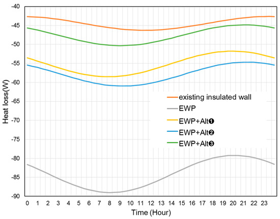 As seen in Figure 8, the existing insulated concrete walls had the lowest heat loss at 12:00, while the developed EWP had the lowest heat loss at 08:00. Because the existing insulated-concrete walls had a heavy-weight structure compared to the EWP, there was a difference of 4 h in terms of time lags [31]. Due to the light weight of the EWP, it had a shorter time lag. Thus, it was subjected to greater influence by outside temperatures than the existing insulated-concrete walls.