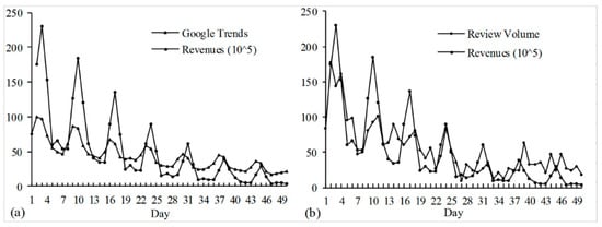 29]. In this study, IMDb.com, Google.com, and BoxOfficeMojo.com are the data sources. We examined movie reviews on IMDb.com, the most popular and authoritative information source for movies worldwide, for approximately seven weeks after movie releases. We then collected daily data on box-office revenues, budgets, and distributors as well as other movie information from BoxOfficeMojo.com. Our unit of time was one day; however, we aggregated the reviews published before the release day into one time window. The weekly Google Trends before a movie release and the daily Google Trends one day before and 49 days after a movie release were obtained and reviewed. Because the unit of time was one day, we had a sufficiently long study period with enough observations to provide credible results. The final dataset included Google Trends and eWOM information for 50 consecutive time windows and revenue information for 49 time windows. All movies were released in the US from 2010 to 2016.