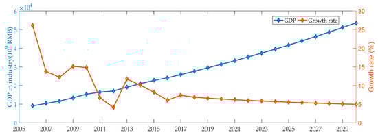 Table 4 displays the history value, fitting value, error, and relative error. It can be found from the results that the TPGM (1,1) has a good fitting effect with an average relative error of 2.24%, thus this model can be used to predict future industrial GDP. The forecast results of industrial GDP in 2017–2030 are shown in