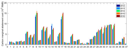 Figure 3 displays the marginal cost of the emission reduction of China’s industry in 2012–2016.