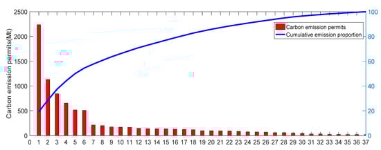 Figure 5 reflects the carbon emission permits of 37 sub-sectors in descending order and the cumulative carbon emissions’ share in 2030 estimated by the proposed method. It was found that most of the carbon emission permits are concentrated in a few sectors, while most sectors get only small amounts of permits. The top six sectors obtained the major part of the industrial carbon emission permits, with a total of 6087 Mt, accounting for 69.23% of the industrial emission license. These sectors (S24, S19, S23, S25, S35, S18) are the cornerstone of the country, providing energy and raw materials to other industries and it is difficult for the economy to survive and develop without them. On the one hand, to ensure the normal development of the national economy, these industrial sectors must be allocated sufficient carbon emission permits. On the other hand, these sectors have great potential for emission reductions, and the government must take targeted measures to tap this potential to achieve emission reduction targets.