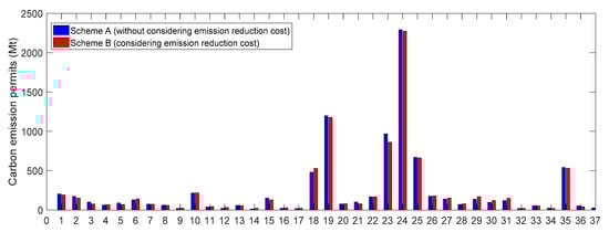 Figure 6 shows the difference between the new scheme and the proposed scheme in this paper (Scheme B). The results show that although the results of the two allocation schemes are very similar, there are still differences. Scheme B allocates a lesser amount of carbon emission permits than scheme A for some sectors with lower abatement costs, such as the smelting and pressing of ferrous metals (S24), manufacturing of non-metallic mineral products (S23), extractive industry (S1, S2, S3, S4, S5), and so on, while scheme B allocates more carbon emission permits than scheme A for some sectors with higher abatement costs, such as the manufacturing of computers, communication, and other electronic equipment (S31), manufacturing of electrical machinery and equipment (S30), and so on.