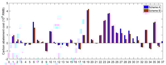 Figure 7 shows the abatement costs for the 37 industrial sectors of the two schemes. As can be seen, there are some sub-sectors whose carbon emission reduction costs are less than 0, which means that these sectors are allocated sufficient carbon emission permits and do not need to reduce their carbon emissions. These sectors should spend money on production or research and development rather than energy saving and emission reduction. Other sectors whose carbon emission reduction costs are greater than 0 need to inject sufficient funds into energy savings and emission reduction to complete emission reduction tasks. Comparing the two allocation schemes, there are 24 sub-sectors with higher emission reduction costs in scheme A than in scheme B, and 13 sub-sectors with lower emission reduction costs in scheme A than in scheme B. However, the total abatement cost in scheme A is 347 million yuan more than that in scheme B according to the estimated results. This means that the allocation scheme proposed in this paper can reduce the cost of emission reduction and meet the needs of China’s current development.