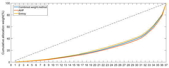 Figure 8 shows the Lorenz curves of the AHP, entropy method, and combined method. It can be found that the entropy method comes close to the line of prefect efficiency, followed by the combined method and AHP method. It suggests that the allocation scheme derived using the subjective allocation method (AHP) has the highest concentration, that is, it is the most uneven, while this extremely imbalanced allocation is mitigated when the objective weight method (entropy) is used. However, due to the inherent characteristics of the different sub-sectors, an excessive balanced allocation scheme may ignore the rationality of emission reduction, leading to excess pressure on some sectors, and an over-concentrated scheme may lead to inefficient emission reduction. Therefore, a suitable degree of balance is the key to the allocation of emission permits, and the combined weight method solves this problem effectively, which is more suitable for the allocation of carbon emission permits.
