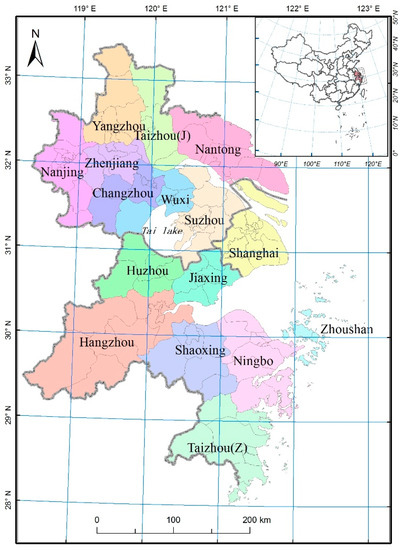 The study area is the Yangtze River Delta (YRD) region, which is located in the east coast of China (Figure 1) and includes 16 municipalities: Nanjing, Suzhou, Wuxi, Yangzhou, Changzhou, Nantong, Taizhou (J), and Zhenjiang of Jiangsu Province; Hangzhou, Jiaxing, Huzhou, Zhoushan, Shaoxing, Ningbo, and Taizhou (Z) of Zhejiang Province; and Shanghai.