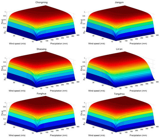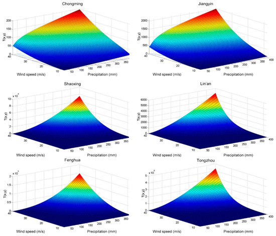 Figure 2 shows the joint probability distribution in Chongming, Jiangyin, Shaoxing, Lin’An, Fenghua, and Tongzhou. The x-axis is precipitation, the y-axis is the wind speed, and the z-axis is the joint probability distribution of rainfall and wind speed that is less than or equal to the set value. The joint probability distribution increases with the increase in rainfall and wind speed. With a certain rainfall and wind speed, the joint probability distribution can easily be obtained from Figure 2. With a certain joint probability distribution (p), there exists group pairs of rainfall and wind speed, which are the intersecting curves of the joint probability distribution surface and the surface of z = p.