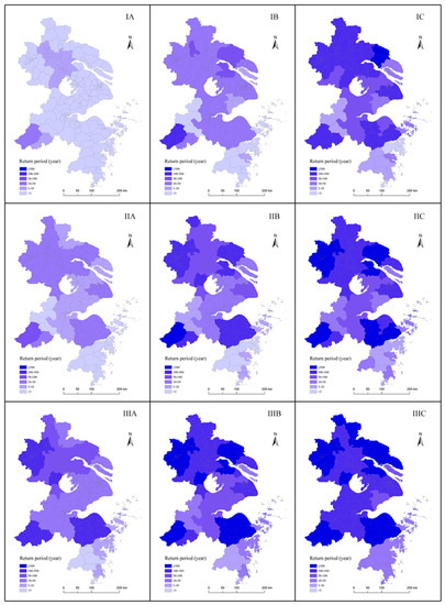To further compare the multi-hazard characteristics in different counties, the joint return period for different types of rainfall and wind speed were calculated. Rainfall was divided into three types according to daily precipitation: type I (50–99.9 mm of daily rainfall), type II (100–249.9 mm), and type III (above 250 mm). Wind was also divided into three types according to the maximum wind speed: type A (10–17.1 m/s), type B (17.2–24.4 m/s), and type C (above 24.5 m/s). Based on Equation (6), the joint return periods of different types of rainfall and wind for the 140 counties can be obtained. The results are shown in Figure 4.