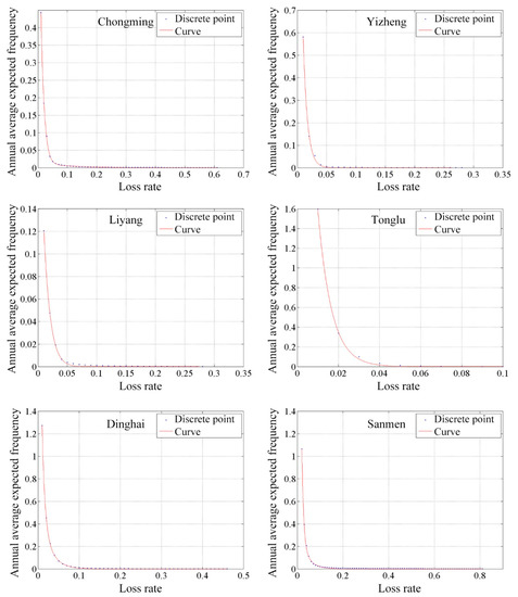 Based on the analysis results of the hazards and vulnerability, the relationship between the return period and the loss rate for 140 counties in the YRD region was individually calculated. Figure 6 shows the loss–return period curves of Chongming in Shanghai; Yizheng and Liyang in Jiangsu; and Tonglu, Dinghai and Sanmen in Zhejiang.