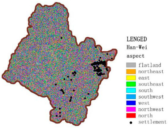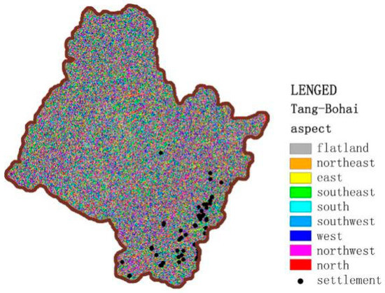Figure 5, Figure 6, Figure 7 and Figure 8 display the elevation calculation of settlement points in the Han–Wei period and the aspect, slope direction, and buffer zone calculation of urban site points. Under the dominance of a fishing and hunting culture, the distribution of ancient settlements in the Han and Wei dynasties were mostly concentrated in the Sanjiang Plain, which had a large number of water systems, complex topography, dense forests, and abundant resources of wetlands and hilly regions between mountains and rivers. During this period, Sushen (肃慎), Yilou (挹娄), Wuji (勿吉), and other ethnic groups with fishing and hunting as their main production methods chose this settlement site to adapt to the characteristics of a hunting and gathering community. The social structure of this period was mainly organized as a clan commune with blood relationship as the bond. Therefore, the overall layout of its settlements was not restricted by the obvious etiquette system and order, which was mainly manifested as the original organization form based on production and life, and dominated by natural geographical conditions.