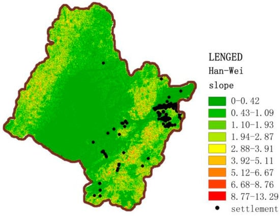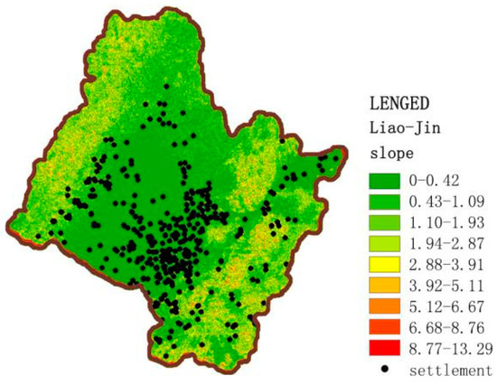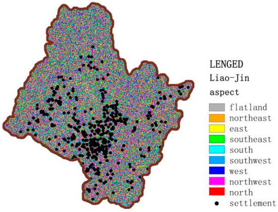 The elevation, slope, slope direction, and buffer zone of ancient settlements in these three periods were statistically analyzed in GIS. Settlement locations in different periods were all selected in the range below 300 m in elevation, and the upward slope aspect of site selection in different periods was mainly a sunny slope. Even in the case of a northwest direction, the slope was gentle and similar to the geographical location of a flat slope, which reflected the limitation factors of the natural environment and production mode for settlement selection. In terms of slope selection, the settlements in different periods were rarely located on steep slopes (Figure 18). During the Han–Wei and Tang–Bohai periods, when hunting and gathering were the main modes of production, the settlements were distributed in large proportions in the plains, hills, and small undulating mountains. However, in the Liao–Jin period, because nomadic culture was the dominant cultural form, the tendency to settle on gentle terrain was more obvious. Most of the urban sites were located in the alluvial and diluvial plain at a low elevation, even though the few urban sites at the edge of the terrain were usually militarily and politically integrated settlements.