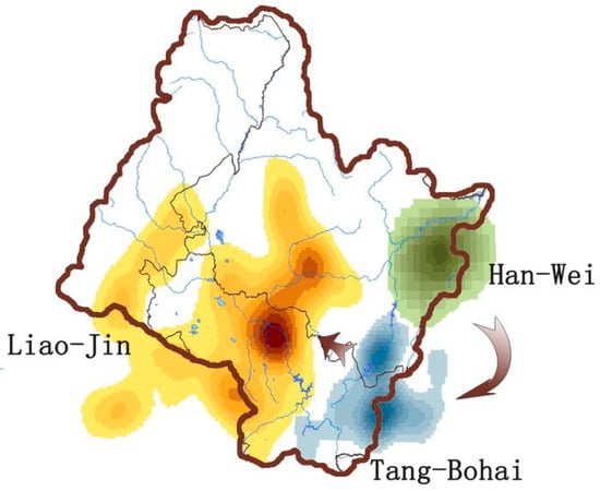 The kernel density of ancient settlements during the Tang–Bohai period.