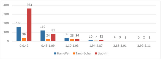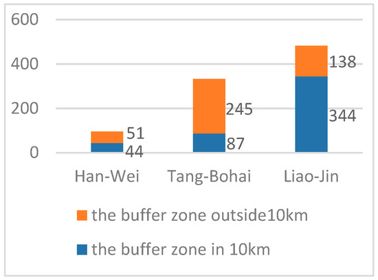 Due to wars and frequent changes of dynasties, the development of ancient settlements in the Songhua River Basin showed a certain period of fracture after the Han–Wei period. The Tang–Bohai period ushered in the development of the second peak (Figure 3). The settlements of Bohai States were mainly distributed in the Mudan River Basin, the largest tributary on the right bank of the Songhua River. At this time, the spatial distribution of the settlements showed that major cities were surrounded by satellite cities, which reflected the migration and infiltration of the Tang dynasty culture.