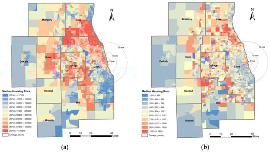 Our study area is the Chicago metropolitan area, including nine counties such as Cook, DuPage, Lake, McHenry, Kane, DeKalb, Kendall, Grundy, and Will. We use various datasets. Specifically, we use median housing price and median rent in 2009–2013 ACS (American Community Survey). Figure 1 shows the spatial distribution of the housing prices and rents in the Chicago metropolitan area. The housing prices in the northern part of Chicago are relatively higher than those in the southern part. The spatial distribution of rent prices looks little different from that of housing prices, but rent prices in the northern part of Chicago are relatively higher, which is similar to the distribution of housing prices. Additionally, we obtain other data, such as housing characteristics, household characteristics, and socio-economic characteristics by census tracts from 2009–2013 ACS. In order to measure the index for mixed land use and job accessibility, we use 2013 LEHD (Longitudinal Employer-Household Dynamics) LODES data. The LEHD data provide spatial information on the employees’ work places and residential locations at the census block level, which allows us to combine LEHD with ACS at the census tract level. Hence, we first aggregate the LEHD at the census tract level, and combine LEHD and ACS, and then calculate job accessibility and mixed land use indices based on the equations explained in the next section.