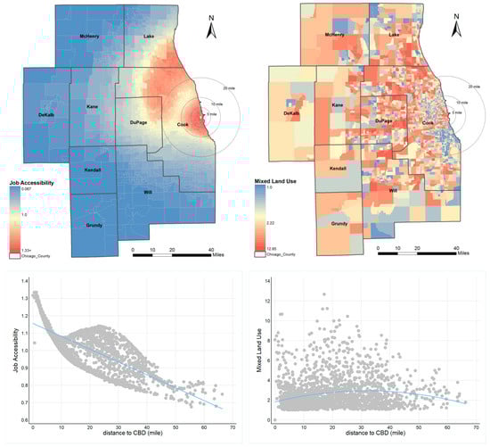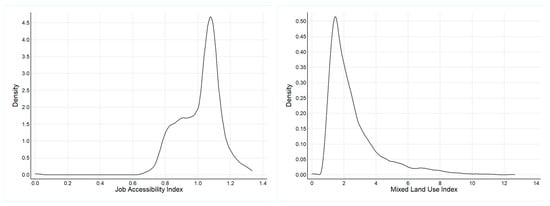 Today’s land use planning and policies are intended to preserve values of cultural resources and enhance sustainable communities and neighborhoods. Among various specific components to achieve these goals in planning practice, the improvement of job accessibility and the encouragement of mixed land use have gaining popularity in the planning field. This is because successfully designing and utilizing these two features through land use and transportation planning not only can reduce individual vehicle mile travel (VMT) and urban traffic congestion [] but can also provide lively urban environments []. In addition, both higher job accessibility and mixed land use have been considered as signature features of smart growth, because increasing these two components makes more workers live near their workplaces. Living closer to jobs and locating closer to workers would have great benefits for workers as well as employers by reducing commuting costs and making employers easier to find. However, although these two elements improve the balance of jobs and housing, they are different in other ways. For example, job accessibility is a global concept encompassing an entire city [,], while mixed land use is a local concept related to neighborhoods []. Hence, they may have different socioeconomic impacts, and should be differently and carefully investigated. However, few studies have examined the differences between these two concepts in housing markets.