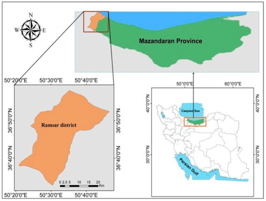 The region that is examined in this work is situated 250 km north of Tehran. The area of Ramsar is positioned west of the region of Mazandaran, which is bordered by the Caspian Sea in the north and the Alborz Mountains in the south. It has a population of about 70,000 according to the 2018 census []. The region is an important area that is renowned for citrus production in Iran. The study site has approximately 6600 ha of citrus orchards []. The location is situated at latitudes 36°32′00″ to 36°59′11″ N and longitudes 50°20′30″ to 50°47′12″ E, and has a total area of about 736.6 km2. The elevation of Ramsar County is between −20 m to 3620 m above sea level, with the lowest point being the Caspian Sea. Its Mediterranean climate is characterized by warm yet dry summers with peak precipitation occurring from September to December. The average yearly rainfall in Ramsar is 1193.5 mm with an average yearly temperature of 17.6 °C. The hotness and aridness occur from May to August in the summer with average temperatures of about 25.2 °C during the warmest month of July []. A map of the area under study is presented in Figure 1.