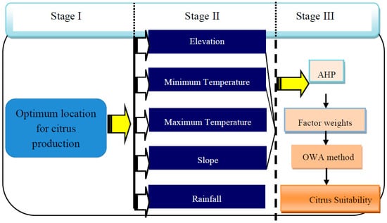 Subsequently, the hierarchical decision framework was developed in AHP as shown in Figure 2. The hierarchical structuring problems were applied to enable the explanation of outcomes through the comparison of the relative importance criteria of the process of policymaking []. Therefore, the most appropriate lands for cultivating citrus trees were identified through the criteria selection presented in stage II of Figure 2.