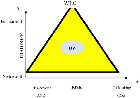 The OWA procedure is a class of combined multi-criteria technique that was established by [], which appraises the significance of every factor at all of the locations and the importance of each factor based on its unique position. Yager, 1988 [] developed OWA as a class of OWA multi-criteria combination operators. The OWA method provides a comprehensive range of policymaking methods spaced alongside the principal dimensions. As a result, there is a compromise degree concerning the criteria selected and the scale of the risk in the resolution. As can be observed in Figure 3, the space for this policymaking approach is located on the x-axis, which characterizes a range from extreme caution (low risk is run) to a completely acceptable risk factor. However, the y-axis signifies the range from no compromise to the maximum amongst the criteria.
