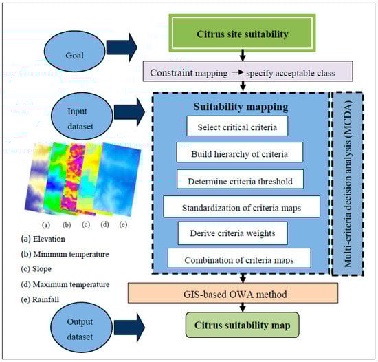 The procedure that was adopted for the suitability of the suggested sites for citrus production was evaluated based on the methodology described in Figure 4. As observed, the schematic in Figure 4 shows the key decision phases for the spatial analysis and hydroclimatological evaluation. The map of constraints is used to mask suitability mapping, whereas the objective of the analytical problem, which was termed the “suitability map”, is hierarchically at the top.