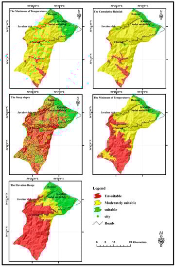 Table 4 represents that elevation; lowest temperature and rainfall are the most important site factors for citrus production in Ramsar, Iran. Table 5 denotes that the most important condition for policymaking is elevation (46%). This is followed by a minimum temperature (23%), rainfall (14%), maximum temperature (10%), and slope angle (4%). As evaluated from Equation (4), the consistency ratio (CR) of the pair-wise matrix is 0.04, which indicates that the accumulated judgments derived from the pair-wise matrix from Table 5 are satisfactory. The comparative significance of individual standards is denoted by the eigenvalue []. Subsequently, the importance of individual site valuation standards was evaluated based on the comparative significance of each criterion and preferences according to specified decision rules. The selected criteria were: elevation, maximum temperature, minimum temperature, slope angle, rainfall, runoff coefficient, and slope, which were calculated by AHP through its pair-wise comparison matrix procedure.