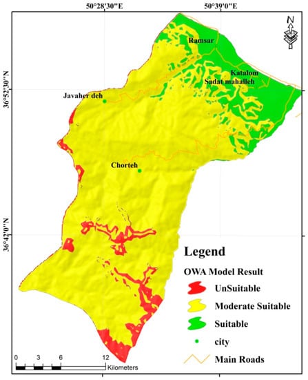 Hence, this study has outlined a GIS implementation of the ordered weighted average (OWA) operator that allows the exploration of a full range of operators such as intersection (AND) and union (OR). The GIS–OWA results are valuable tools that assist decision makers in order to determine suitable sites for optimum citrus production. In addition, the GIS-based MCE technique using OWA examined siting problems based on the various possible choices by addressing multiple criteria and contradictory objectives. The GIS–AHP module demonstrated that the tool was simple, spatial, and flexible. The results showed that the northern regions (mainly adjacent to the Caspian Sea) are the most suitable locations for citrus production in Ramsar. It allocates much more lands to the second level of suitability evaluation.