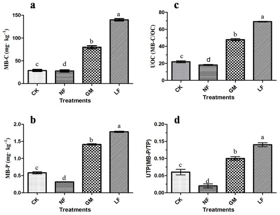 Soil microbial biomass carbon (SMB-C) and soil microbial biomass phosphorus (SMB-P) were significantly improved in the tea rhizosphere in the order of LF > GM > CK, respectively. However, NF treatment did not improve SMB-C and SMB-P in the rhizosphere of tea but inhibited it to some extent (Figure 1a,b). The utilization rate of organic matter (UOM) = (SMB-C/OM) and total phosphorus (UTP) = (SMB-P/TP) ratio (calculated at 1000 times the original value) of rhizosphere microbes in LF and GM treatments were significantly increased as compared to the sole mono-cropping tea orchard (CK) (Figure 1c,d).