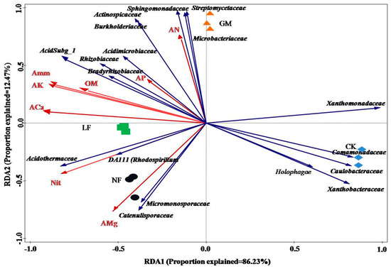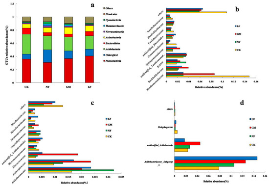 High throughput sequence analysis results showed that Proteobacteria (35.91%), Acidobacteria (23.22%), Chloroflexi (12.27%), and Actinobacteria (8.23%) were major bacterial phylum in tea rhizosphere soil (Figure 2a). The relative abundance of bacterial communities in the top three families is shown in Figure 2. Proteobacteria contained Xanthomonadaceae (7.34%), Burkholderiaceae (2.69%), and Rhodobacterace (2.42%) families in tea rhizosphere soil. Most of the bacteria were types of plant pathogens in the Xanthomonadaceae. These results showed that the relative abundance of the Xanthomonadaceae family in the rhizosphere of 20-year monoculture degraded tea garden was the highest followed by GM treatments (Figure 2b). Burkholderiaceae and Rhodobacteraceae (DA111) showed an increasing trend under NF and GM treatments, respectively. In the Burkholderiaceae, most of the bacteria could break down aromatic compounds. The relative abundance of Burkholderiaceae was 2.17% and 3.92% under NF and GM treatments, respectively (Figure 2b). Furthermore, the relative abundance of Rhizobiaceae and Bradyrhizobiaceae increased in LF and GM treatments, respectively, which are mostly a kind of nitrogen fixer and plant growth promoting bacteria. The study identified Rhizobium as a kind of nitrogen-fixing bacteria, and the relative abundance of Rhizobium was increased by 0.88% under LF treatment, and there was a downward trend in N fertilizer. The relative abundance of Rhizobiaceae and Bradyrhizobiaceae was 2.22% and 3.0%, respectively (Figure 2b). Acidothermaceae is the main family of Actinobacteria (Figure 2c) and its relative abundance in LF and GM was in the range of 1.63% to 3.21%. Compared with untreated soil (CK), the relative abundance of Acidothermaceae was increased in the order of NF > LF > GM > CK, respectively. The relative abundance of Acitinospicaceae and Micrococaceae were increased in the order of GM > LF > NF > CK, respectively (Figure 2c). Acidobacteriaaceae, Unidentified_Acidobacteria, and Holophagaceae were the main populations of Acidobacteria in the rhizosphere soil of tea (Figure 2d).The relative abundance of Acidobacteriaaceae was improved in the order of LF > GM > CK > NF, respectively (Figure 2d). The relative abundance of Unidentified_Acidobacteria in GM treatment was significantly higher than that of CK, LF, and NF treatments (Figure 2d).