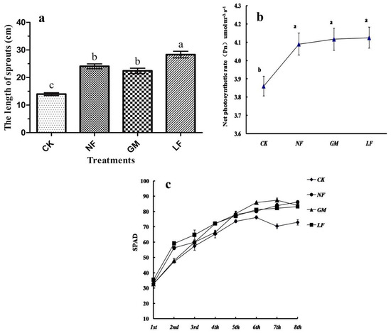 Effects of Different Fertilization Treatments on the growth, developments, and physiological characteristics of tea leaves. (a) Length of new tea sprouts under different treatments. (b) Photosynthetic rate (Pn) of the third tea leaf in young sprouts under different treatments. (c) Content of the leaf chlorophyll from the top to the base of the tea plant under different treatments. Note: Different letters i.e., a, b and c showed a significant difference from each other at p > 0.05.