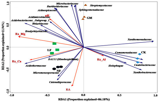 RDA triplot and exchangeable acidic ion interactions with major bacteria families of tea rhizosphere soil under different treatments.