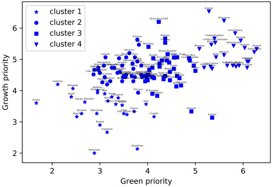 To illustrate how the green governance context may be categorized into the proposed quartered division, we began by operationalizing FDI policy and environmental regulation and then conducted cluster analysis of the countries identified by WEF’s EOS. To identify clusters, we conducted cluster analysis using the K-means clustering method. Cluster analysis refers to the process of grouping a collection of physical or abstract objects into multiple classes of similar objects. The K-means is a classic partitioned cluster analysis method that is well-known for its efficiency in clustering large-scale data sets. The data were classified into K clusters, and each cluster was given a category center. The Euclidean metric was selected as the criterion of similarity and distance, and the sum of squares of the distance between the points in each class to the center of the cluster was calculated to minimize the sum of squares within each cluster [144]. We implemented K-means clustering using scikit-learn in Python 3.6. Our initial centers for the four groups based on pairs (standardized FDI score, environment score) were assigned as follows: the low–low cluster was initialized at (2, 2), low–high at (2, 6), high–low at (6, 2), and high–high at (6, 6). Vertically, it was clustered by the average scores of countries’ FDI attractiveness in WEF’s EOS 2011–2016; for compositional and graphical simplicity, we labeled the matrix “growth priority”. Horizontally, it was clustered by the average scores of countries’ environmental regulatory stringency of WEF’s EOS 2011–2016, and we labeled this matrix “green priority” (Figure 1).